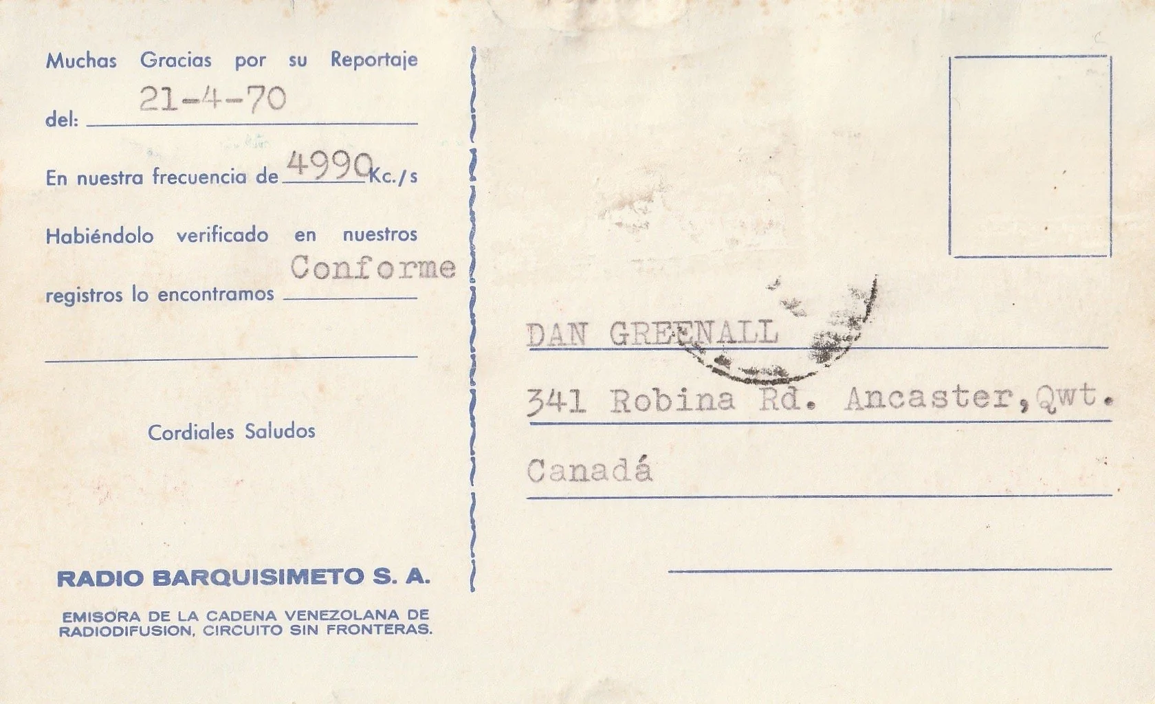 Notes: On 4990 kHz shortwave, Radio Barquisimeto in Venezuela was one of the "regulars" on the 60 metre band here in southern Ontario Canada during the evening hours in the 1970's. On nearby 4980 kHz, you could find Ecos del Torbes from San Cristobal.